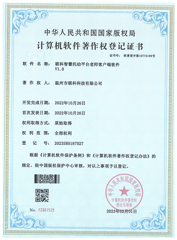 聯(lián)科智慧托幼平臺(tái)老師客戶端軟件V1.0登記證書(shū)(2022R11L2332140)