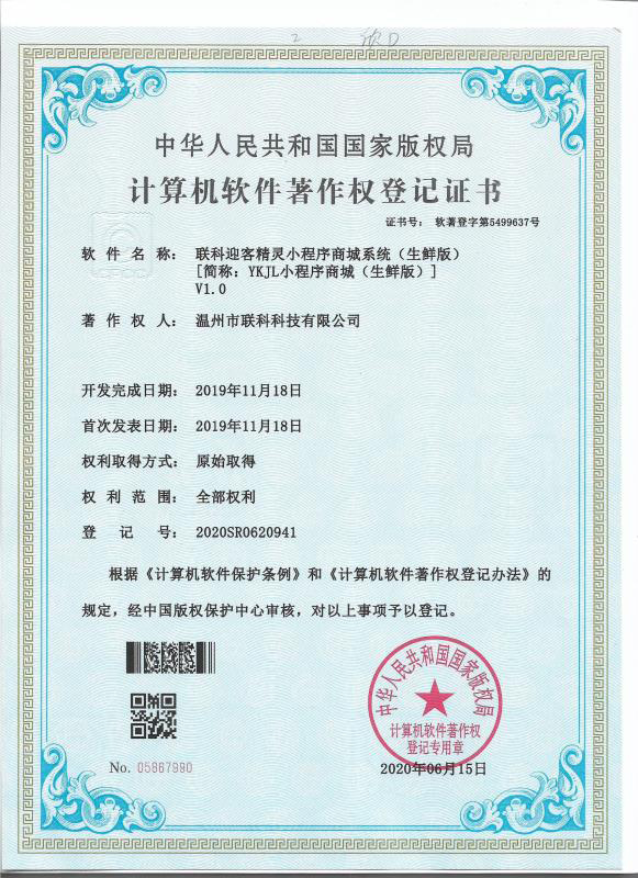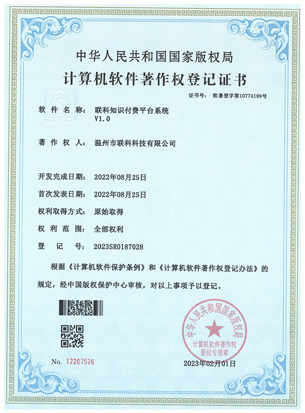 聯(lián)科知識(shí)付費(fèi)平臺(tái)系統(tǒng)V1.0登記證書(shū)(2022R11L2324406)