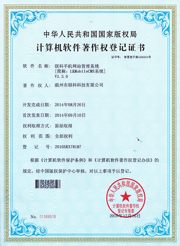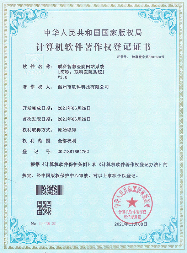 聯(lián)科醫(yī)院網(wǎng)站集約化管理平臺(tái)V1.0登記證書(shū)(2022R11L2489282)