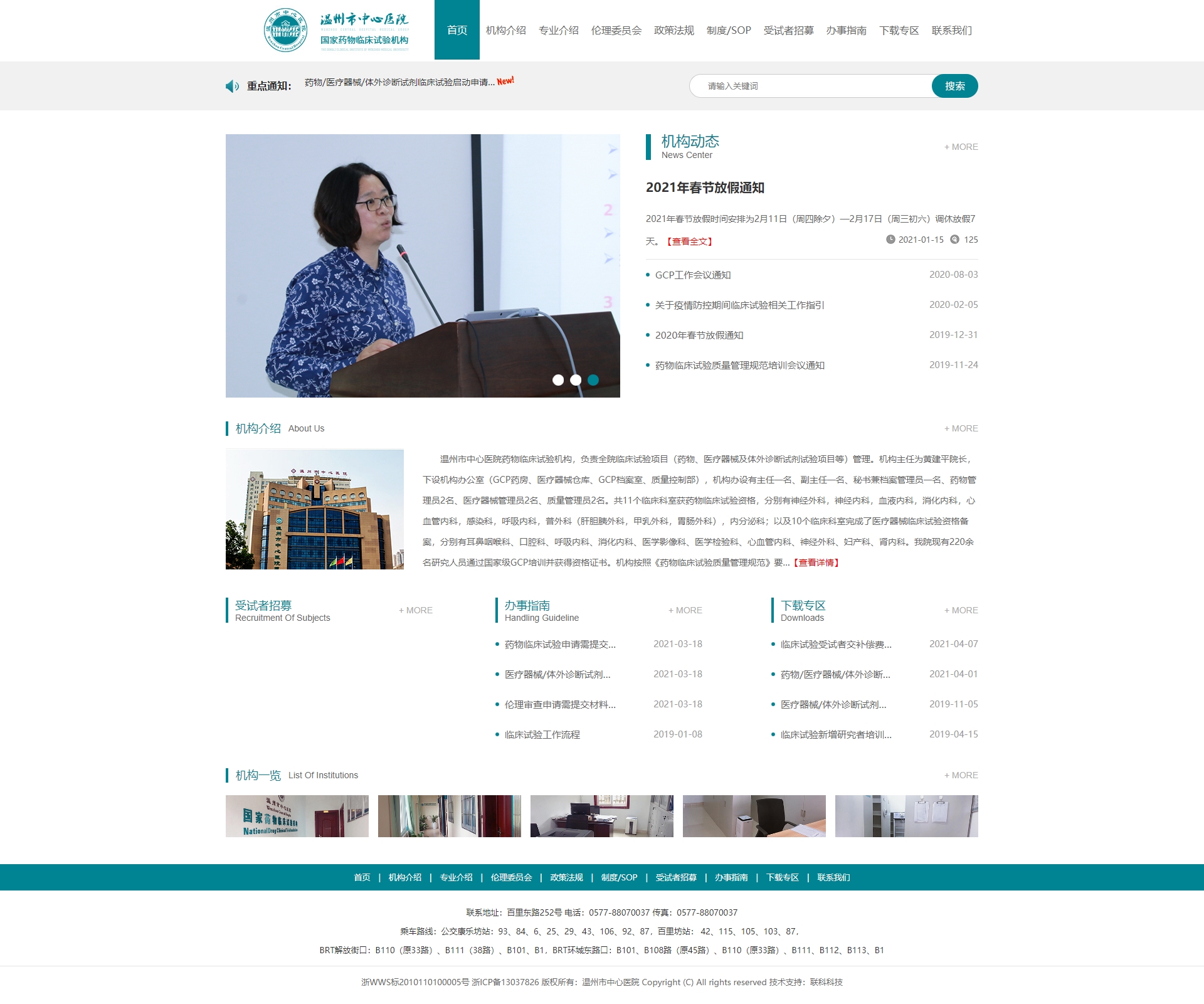溫州市中心醫(yī)院藥物臨床試驗機(jī)構(gòu),負(fù)責(zé)全院臨床試驗項目(藥物、醫(yī)療器械及體外診斷試劑等)管理。機(jī)構(gòu)主任為黃建平書記,機(jī)構(gòu)副主任張立群院長,下設(shè)機(jī)構(gòu)辦公室(GCP藥房、醫(yī)療器械倉庫、GCP檔案室、質(zhì)量控制部),機(jī)構(gòu)辦設(shè)有主任1名、副主任1名、秘書兼資料管理員1名、藥物管理員2名、醫(yī)療器械管理員2名、質(zhì)量管理員2名。共11個臨床科室獲藥物臨床試驗資格,分別有神經(jīng)外科,神經(jīng)內(nèi)科,血液內(nèi)科,消化內(nèi)科,心血管內(nèi)科,感染科, 呼吸內(nèi)科,普外科(肝膽胰外科,甲乳外科,胃腸外科),內(nèi)分泌科。