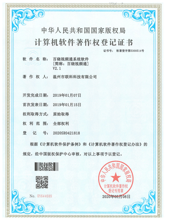 《百曉視頻通系統(tǒng)軟件V2.1》于2020年05月08日被正式授予《中華人民共和國國家版權(quán)局計(jì)算機(jī)軟件著作權(quán)登記證書》,登記號為2020SR0421818。