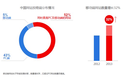 在這份報(bào)告中,我們不難看出PC與移動(dòng)的同步發(fā)展是未來的一大趨勢(shì),就拿2012年與2013年的移動(dòng)端網(wǎng)站的情況對(duì)比,2013年的移動(dòng)端網(wǎng)站數(shù)量增加了32%,而這一數(shù)據(jù)還保持著快速增長(zhǎng)的發(fā)展趨勢(shì)。