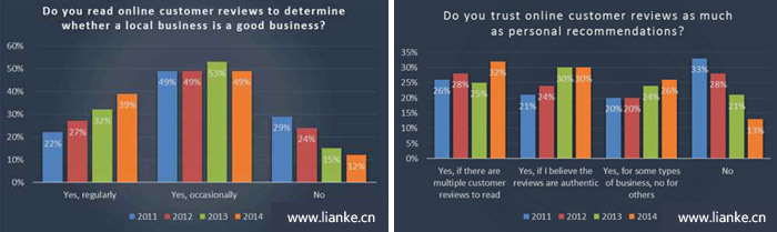 言歸正傳,談?wù)勗诰€評(píng)論與SEO吧,啟示和結(jié)論都來(lái)自BrightLocal 的一份消費(fèi)者報(bào)告。報(bào)告顯示,88%的人會(huì)信任在線評(píng)論并且根據(jù)評(píng)論做出選擇和決策。如下圖1與圖2所示: