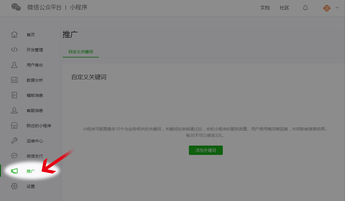 點擊小程序管理后臺左側(cè)”推廣”欄目進入