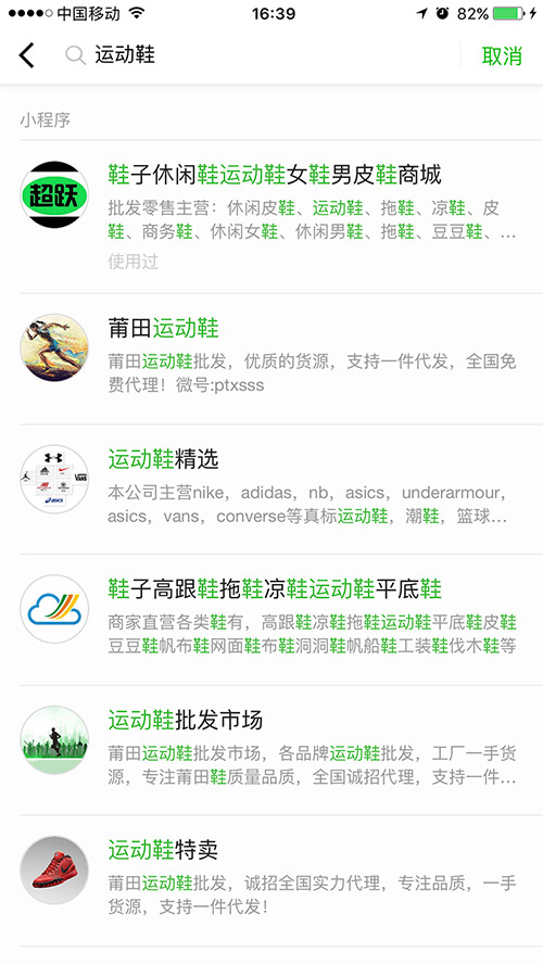 比如上面的圖片中,小程序中搜索關鍵詞“運動鞋”,就出現(xiàn)很多相關的關鍵詞,如男鞋、女鞋、涼鞋、皮鞋、商務鞋等這些用戶使用頻率高的產(chǎn)品關鍵詞,當用戶去搜索男鞋、女鞋這些詞的時候這個小程序依然會有展現(xiàn)的概率。